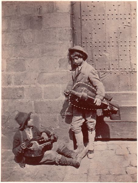 Curator: Félix Bonfils, active in the late 19th century, captured this striking portrait, "Jews of Jerusalem," now residing at the Harvard Art Museums. Editor: There's a certain austerity to it, almost biblical in its somber tones and direct gaze. It feels…untouched. Curator: Indeed, the composition directs our attention to the subjects' attire and the textural variance of the stone wall behind them. Semiotically, each element functions as a signifier of cultural identity. Editor: For me, it is the raw, unvarnished quality of the moment that speaks volumes. You can almost feel the weight of history pressing down. It's as if they're standing not just in front of a wall, but in front of time itself. Curator: Precisely. Bonfils uses the formal qualities of photography—light, shadow, and the very materiality of the print—to evoke a sense of enduring presence. Editor: It's a powerful reminder of the human stories embedded in these places. I find myself wondering about their lives, their hopes, their fears… Curator: A photograph such as this one compels us to look closer not only at the image, but at ourselves, and what we bring to the act of viewing. Editor: Agreed, it stirs up a potent mix of curiosity and reflection. It’s more than just a picture; it’s a window into another world.