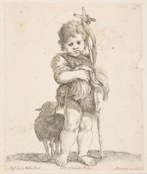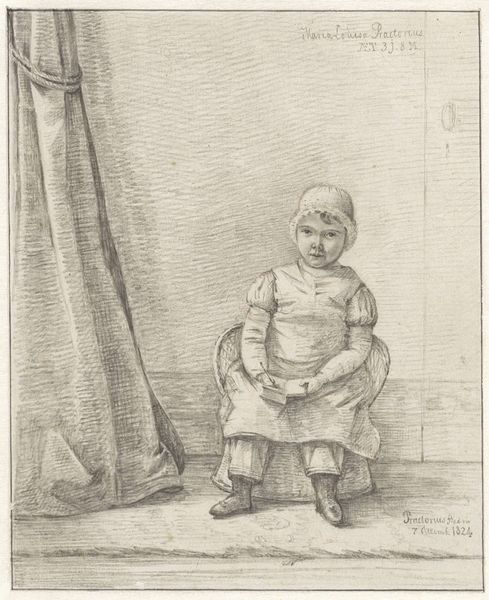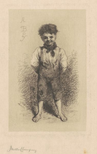Editor: This is F. Hendriksen’s “Illustration til Chr. Richardt, “Naar jeg blir stor”,” made sometime between 1847 and 1876, using drawing, printmaking, engraving, ink, and what appears to be pencil. The image evokes a certain melancholy. The figure of the child feels rather isolated and solemn within the frame. What stands out to you about this piece? Curator: The strength of this work lies in Hendriksen’s mastery of line. Observe how varying the pressure and density creates both form and texture. The hatching and cross-hatching, particularly in the child's overalls, don't just describe the garment, they suggest a certain weight, a palpable materiality. Notice too, the economy of line. The artist refrains from unnecessary details, focusing instead on the essential forms needed to convey the image. What do you make of the bare background? Editor: The bare background puts even more emphasis on the figure, focusing us on the child’s pose and expression. Is that sense of isolation intentional, then, directing our attention to the graphic form itself? Curator: Precisely. Consider the formal tension created. The softness of the child's features, rendered with delicate lines, is contrasted with the more angular treatment of the clothing and the starkness of the setting. There’s an inherent dichotomy in the execution that I find compelling. And tell me, does the engraver’s use of line here serve merely to illustrate or does it do something else, something more complex? Editor: It seems like it’s not just illustrating the poem; the technique itself is conveying feeling and depth. The formal elements enhance the narrative. I see it now. Thank you! Curator: Indeed, and paying close attention to the elements of form allows us entry to understanding its complexity.