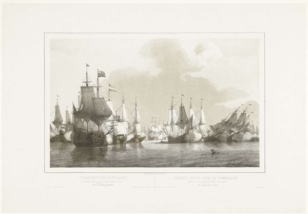 Editor: This etching, “De Tweedaagse Zeeslag, 1666,” by Petrus Johannes Schotel, was created between 1848 and 1855 and depicts a chaotic naval battle. I'm struck by the sheer density of ships and the billowing smoke; it’s incredibly dramatic. What do you see in this print, beyond the immediate representation? Curator: Immediately, I notice the meticulous attention Schotel gives to the articulation of forms, most especially in the rendering of the rigging and hulls. How does the composition direct our gaze? Do you notice any intentional contrasts? Editor: The ships overlap a lot, but there's also so much negative space between them, with masts reaching upward. And, of course, the black and white makes a sharp contrast. Curator: Precisely. It is through such contrasts—the verticality of the masts against the horizontality of the water, the solidity of the ships against the ethereality of the smoke—that Schotel generates visual interest. Observe also the light; notice how the bright highlights catch certain sails, directing our vision through the melee. What effect does this focused illumination have on the overall reading of the image? Editor: I see what you mean; the light seems to create a sense of depth, almost pulling us into the scene. It makes it seem much bigger. I hadn’t noticed that interplay before. Curator: The manipulation of light and shadow, form and void, are all meticulously calibrated to elicit a particular aesthetic response. In focusing our analysis on these intrinsic elements, we begin to decode the work's power, beyond merely documenting a historical event. Editor: So, focusing on composition reveals much more than just historical record. I appreciate understanding that more today.