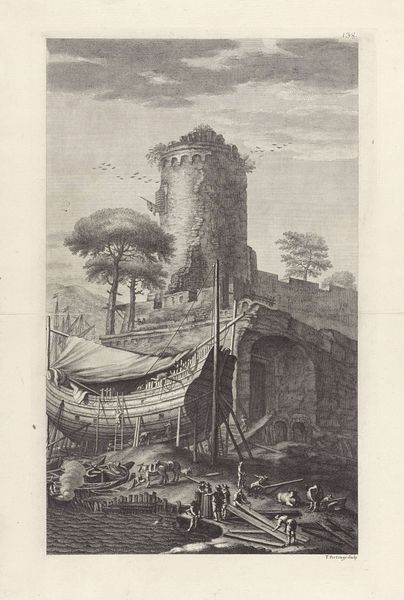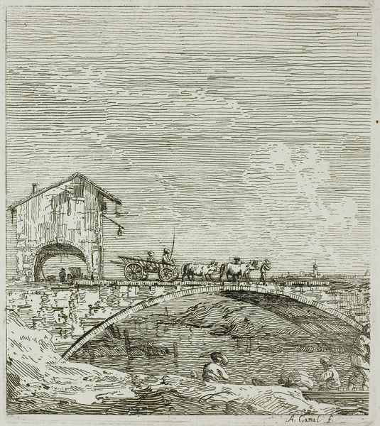 Curator: Here we have Fabio Berardi’s "River Scene," an etching and engraving on laid paper, created sometime between 1745 and 1775. It’s currently housed at the Metropolitan Museum of Art. Editor: Wow, what strikes me immediately is this odd combination of crumbling architecture and those puffy clouds. There's a melancholy grandeur, almost like a stage set after the play. Curator: That's a beautiful observation. The Baroque period was fascinated by decay and the ephemeral nature of existence. Berardi really captures this with his attention to the weathering on the stonework, the slightly overgrown feel. He’s imbuing it with emotion. Editor: Precisely. Notice the circular building to the top? It hints at an idealized form. The sharp lines feel controlled. However, I’m wondering what river he chose, or even what building. Does the architecture have meaning? Curator: I agree the architectural details feel somewhat…imagined, perhaps pieced together from different sources. It could be seen as commentary of the time, like, a meditation on time, decay, and the human attempt to create something lasting in a constantly changing world. The water could represent continuous change and how humans perceive the notion. Editor: I get a tension from the artwork as well; a push and pull. Those foreground figures are almost playfully positioned against the architecture that seems to weigh everything down. Perhaps they embody humanity’s enduring spirit or the endless cycle of recreation! Curator: You've picked up on something essential. The figures offer us a point of access. Even amid this supposed decay and contemplation, there’s life going on. They're almost oblivious. Which makes them quite charming in their obliviousness, almost ironic. Editor: I'm wondering about the people’s role, especially concerning that single person, standing. They seem so out of context, but it really highlights human perseverance. I find it really thought-provoking and engaging. Curator: And that, for me, is where the brilliance lies. It doesn't provide answers, but asks compelling questions. It urges one to consider the symbols in our lives today. Editor: Indeed, a really interesting visual statement on resilience that persists in the viewer’s thoughts. It’s that layering of the beautiful with the temporal that will always have meaning.