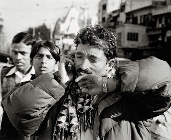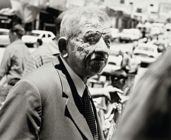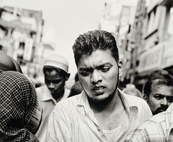 Editor: We're looking at "Karachi, 2008, near Empress Market," a black and white photograph by Leo Rubinfien. The close framing creates a real sense of intimacy, but also a kind of tension, maybe even unease, focusing on the gaze of one man amidst a crowd. What strikes you most about this image? Curator: It's the eyes, isn’t it? That penetrating stare. In the context of Karachi, Empress Market – a place teeming with commerce and everyday life - the gaze becomes a symbol. Think of it as a visual metaphor. What do you think he's seeing? Or, perhaps more importantly, what does he *represent* seeing? Editor: I initially read it as suspicion, or maybe directness... but now that you mention it, his gaze could symbolize something more profound...maybe a critical observation of society? Curator: Precisely. Consider the power dynamics inherent in observation, particularly in post-colonial contexts. The black and white medium strips away superficiality, leaving us with the raw human experience. Does the photograph offer commentary on societal visibility and power, or perhaps, the burden of awareness? Editor: So, it's less about what *he* is specifically thinking and more about what his presence *represents* in the bigger picture of Karachi society and its history. The visual language here conveys the collective anxieties of that time. Curator: Exactly! Each element, even the out-of-focus figures in the background, plays a role in constructing this symbolic narrative. How do *we* as viewers, fit into the power dynamic constructed through the lens of this image? Editor: This makes me see the image completely differently now. It’s not just a street portrait, it’s a lens into the deeper cultural psyche. Curator: And it’s in photographs like this that reveal cultural memory and offer continuity with our world. We are not passive viewers, but part of the conversation this image invites.