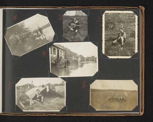 Curator: This is a fascinating series of gelatin silver prints dating from around 1930. The artwork, entitled "Vier portretten van Herman Besselaar, waarvan twee met kennissen," roughly translates to "Four portraits of Herman Besselaar, two of which with acquaintances." Editor: They have a somber quality to them, wouldn't you say? A melancholic echo of a bygone era captured in muted monochrome. The overcast light seems to emphasize a shared restraint or social reserve. Curator: Indeed. The framing of the portraits offers insights. Note how in the two on the bottom row Besselaar is positioned either on or adjacent to pathways. Editor: Yes, in both individual shots he is standing in a path. Could that pathway symbolize a journey, perhaps even life’s journey? I wonder about the social context of these photos. It makes me think of issues of social class and the conventions around portraiture at the time. Who had access to having these photographic memories created? Curator: Photography's increasing accessibility at this time does shift those power dynamics slightly, while retaining that symbolic power to preserve a specific desired image. Let's consider the photograph featuring the group of men standing next to a river or canal; water is a powerful symbol, representing transformation, reflection, and the subconscious. Editor: Good point about photography becoming more available but still exclusive. I also wonder who Besselaar was. Was he affluent? Also what’s compelling is how ordinary it seems at first. You start thinking about themes of belonging, isolation, the societal pressures individuals face in constructing their identities and presenting them to the world, and how they relate to Besselaar himself, of course. Curator: The more we observe these visual signifiers, the more potent they become as artifacts of not only individual experience, but of cultural memory. We reconstruct it and it reflects upon our own present day, our contemporary concerns. Editor: That’s right. So even in what appears as mundane, in the every day, we often grapple with significant human questions, then as now. What starts as a look at a person ends up a reflection on culture. Curator: Yes. In contemplating these portraits, it underscores how deeply rooted our own stories are to broader social narratives and continuities. Editor: Ultimately these simple pictures can become powerful prompts for us to contemplate ourselves and society.