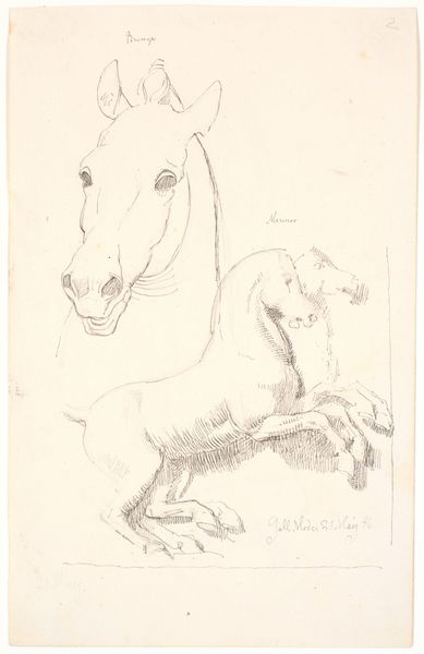 Editor: This is Barry Flanagan's "Cob Study," a line drawing of horses in the Tate Collection. It feels very ancient to me. What symbols or ideas do you see represented here? Curator: The horse is a powerful, cross-cultural symbol, often linked to virility, freedom, and the untamed. This drawing evokes Paleolithic cave paintings, suggesting a primal connection. Do you see how Flanagan uses line to suggest both the form and the spirit of the animal? Editor: Yes, it's like he's capturing their essence with just a few strokes. It feels both immediate and timeless. Curator: Precisely. It reminds us that certain images resonate across millennia. What feelings arise when you consider that continuity? Editor: It’s humbling, realizing we're part of this long visual conversation.