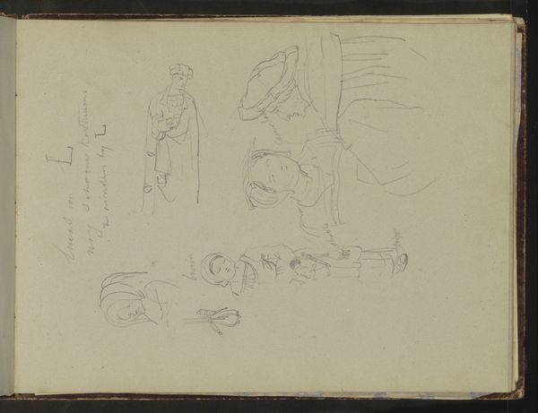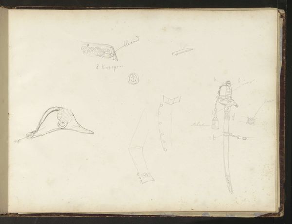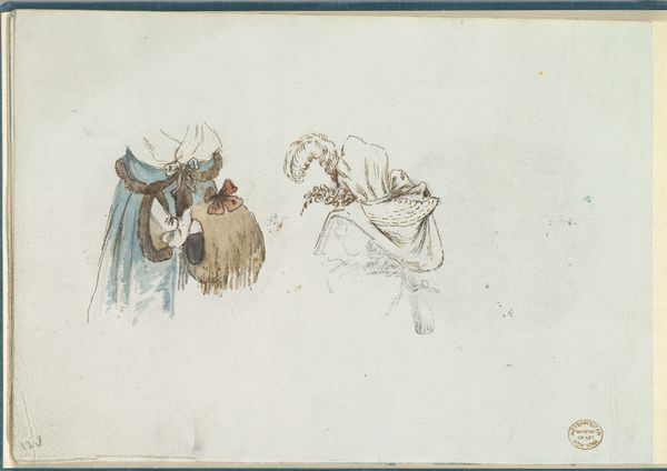Editor: Here we have "Three Costume Sketches of a Bonnet, a Cloak, and a Hat," dating from 1785 to 1790. It's an anonymous drawing rendered in pencil on paper, and the wispy linework gives it an ethereal quality. What do you notice about the way these forms are rendered? Curator: The almost clinical quality of the lines is striking; the sketches seem less concerned with conveying volume and more dedicated to defining shape. Note, too, how the negative space activates each costume, giving the set an airy feel, despite its neoclassical subject matter. It’s as though the garments possess their own latent movement. Editor: Do you think the artist was going for objective representation over subjective expression? Curator: That's a productive way to look at it. These forms have a deliberate air of detachment. The artist avoids sentimentality. We see function and shape—the platonic ideal of "cloakness" and "hatness"— not the emotional or social narratives a Romantic might pursue. Consider how the lack of shading flattens the image, focusing our attention on the relationship between lines and form. What effect does this have on the work's overall meaning? Editor: It does lend a certain precision, a focus on the architectural aspect of clothing almost. So the sketches become about the abstract shapes of garments more than what they represent. Curator: Precisely. The power lies not in historical storytelling, but in the interplay of line, form, and negative space. These elements form an analytical discourse on dressmaking. Editor: I see what you mean. Looking closely reveals layers of visual intention that reshape my perspective on art from this era. Curator: Indeed. A dedication to the elemental can often unlock a work's greatest potential.