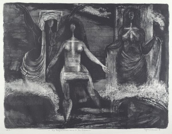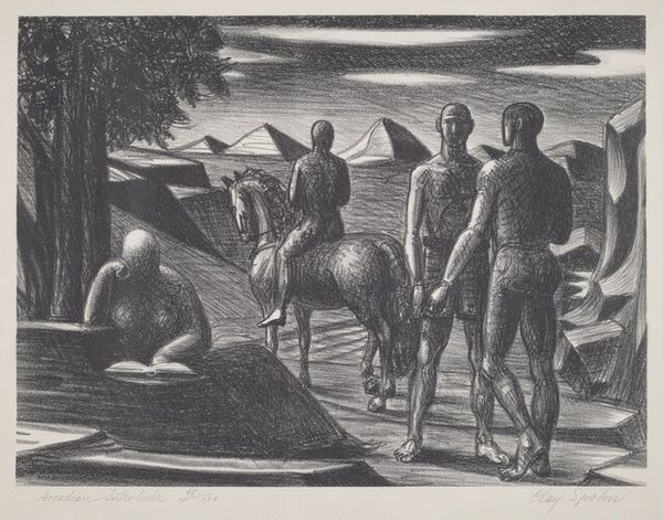 Editor: So, this is Harriet Keese Lanfair’s "Untitled (At The Beach)," likely from around 1935. It appears to be a print, maybe an etching, depicting a group of figures. There's a casual, almost intimate feel to the gathering, but the monochrome and texture also give it a sense of distance. What catches your eye in this composition? Curator: The interaction of light and shadow is compelling. Notice how the artist uses chiaroscuro to model the figures, creating volume and depth within a limited tonal range. The textural variations achieved through the etching process are significant. Do you see how the density of lines alters the surface? Editor: I do, especially in the foreground versus the background, which appears much more loosely rendered. It almost feels unfinished, or perhaps intentionally ambiguous? Curator: Precisely. The ambiguity forces us to consider the materiality of the work itself, rather than simply reading it as a straightforward depiction. The surface becomes activated. What relationship, do you think, exists between the figures and the landscape they occupy? Editor: Well, the landscape almost seems to dissolve into the figures; they blend together, sharing the same visual space rather than existing separately. Curator: An astute observation. Consider then, how this collapsing of figure and ground affects our understanding of space and form within the composition. The work resists narrative, turning us instead towards its formal elements. Editor: I see it now. It’s less about the who and why and more about the how—how the lines, the textures, and the light create a sense of intimacy but also detachment. It's made me reconsider what's most important to notice first. Curator: Indeed, a close reading of the formal components reveals its complexities. It highlights the essence of form itself.
