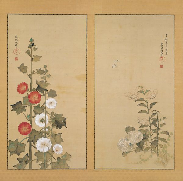 Curator: At the Harvard Art Museums, we have ItÅ JakuchÅ«’s "Chrysanthemum," painted on silk. It has an unusual, muted palette. Editor: Yes, the subtle gradations of pink and green create a delicate tension—almost ethereal. It is a very elegant example of botanical art. Curator: What strikes me is the cultivation process—the careful breeding required to produce a flower like this. It speaks to a specific moment in Japanese history. Editor: Indeed, but consider the composition itself—the way the artist positions the blossom and the leaves to guide the eye, and the subtle ink washes to create depth. Curator: And the silk ground, it is the economic realities that made such luxury goods accessible and desirable that really captures my attention. Editor: The balance between representation and abstraction makes the artist’s mastery unmistakable. A fascinating interplay overall!