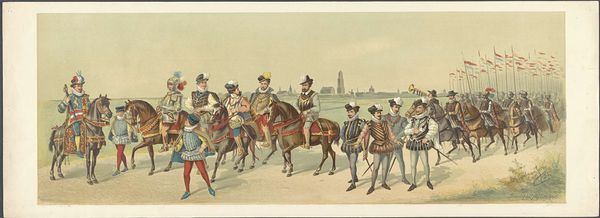 Curator: What a captivating tableau. This watercolor print, dating back to 1881, is entitled "Utrechtse Maskerade van 1881 (eerste plaat)". The identity of the artist remains a mystery to us. What are your immediate impressions? Editor: My first thought is processional. It feels meticulously staged, like a very self-conscious performance of power and history, even though the tones are almost muted and faded. Curator: That's a great point about the faded tones, as the symbolic use of colour during that time carried so much meaning. Do you think the paler palette tones down the statement? Editor: I think so. But I wonder, faded for whom? Consider how this maskerade presents a romanticized past. The meticulous uniforms, the civic architecture in the background… Who is being included, and perhaps more importantly, who is being excluded from this historical narrative? Is this simply civic pride on display or a deliberate political assertion? Curator: That's astute. Thinking of it as a political assertion, these figures might serve as symbols that anchor viewers to particular values and beliefs. Editor: Precisely! It's not just about colourful costumes or a historical parade. It’s about establishing a continuity and celebrating the historical status quo. What is your view about that big building to the left? Does it represent temporal authority? Curator: Given the architectural grandeur, I am led to believe it probably does. Buildings such as this act as constant reminders. A physical assertion that permeates one's consciousness simply by passing by. It could function as an immutable backdrop that contextualizes such historical celebrations like this masked parade. Editor: So, we see these carefully positioned symbols being layered into both the physical landscape of Utrecht and the historical memory of its people. An act of curation in itself, really, in every sense. Curator: Indeed, whether intended as an earnest representation or a conscious work of cultural messaging, either interpretation can spark powerful dialogues about history, power, and representation, centuries on. Editor: Exactly, and hopefully that is exactly what it did here.