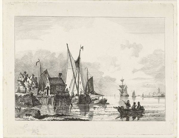 Editor: Here we have "De Zaan bij Wormerveer," likely from around 1790, attributed to Carel Frederik Bendorp. It’s a watercolor showing a busy waterside scene, dotted with windmills. What strikes me is how the scene captures the everyday rhythm of life, labor in the presence of industrial technology. How do you see this piece? Curator: Well, focusing on the materials and process, this watercolor presents a fascinating look at 18th-century Dutch industry and its portrayal. Consider the paper itself: its sourcing, preparation, and how it absorbs the pigment all speak to the means of artistic production. More interestingly, note how Bendorp positions the windmills – these early machines – alongside the manual labor of the figures on the docks. Do you think it elevates them or simply depicts co-existence? Editor: That's interesting. I hadn’t thought about the choice of watercolor and paper as part of the commentary, and find this aspect revealing in relation to your perspective on materialism and art. I wonder whether the somewhat softened effect of watercolor normalizes the presence of windmills by depicting labour, which after all is human effort. Curator: Exactly. Watercolor, often associated with amateur or topographical art, is employed here to depict the mechanics of Dutch trade, seemingly contradicting traditional "high art." How does that challenge the usual hierarchy separating art from craft, labor from leisure? The level of detail here also indicates that a large segment of the society engaged in those industries. The print shows their involvement in producing resources and technologies and shows us the beginning of contemporary culture that uses the output of these windmills to trade goods all over the world. Editor: It reframes the scene, definitely. Now it feels less like a passive landscape and more like an active representation of production. I’m starting to see how Bendorp is presenting not just a scene, but an interconnected system of materials, labor, and industry. Curator: And, thinking more broadly, how does the consumption of art – watercolors specifically at this time, shape what is and what is not considered important, or worthy of depicting? Editor: That's a great question to consider. This discussion has shifted my perspective. I initially saw a pretty waterside scene, but now I recognize the layers of meaning embedded in the materials and the way labor is portrayed. Thank you for opening up these ways of seeing the picture, especially from the materialist viewpoint. Curator: It's been insightful for me as well, rethinking the socio-economic conditions of its production.