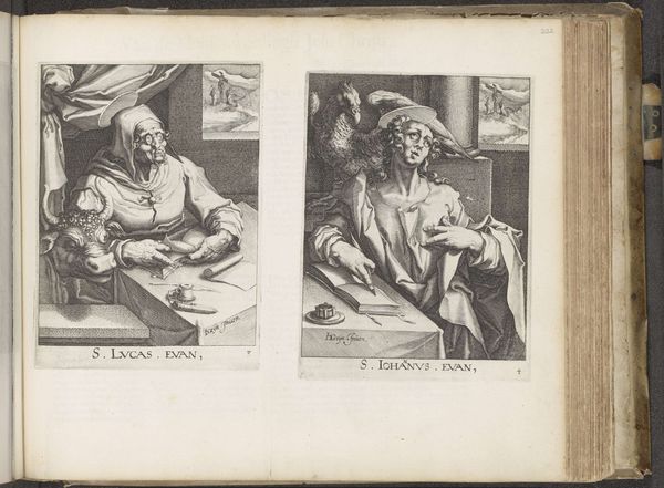 These engravings of the Evangelists Matthew and Mark were made by Zacharias Dolendo in the late 16th or early 17th century, during a time of great religious and political upheaval in Europe. The figures are depicted in their traditional roles as authors of the Gospels, their likeness and association to specific animals derived from the Book of Ezekiel. Matthew, accompanied by an angel, is shown with focused intensity, quill in hand, deeply immersed in his writing. In contrast, Mark seems to be looking down at the Lion in a box under the desk with compassion. During this time, religious identity was closely tied to political power, and the rise of Protestantism challenged the authority of the Catholic Church. These images reflect the cultural and religious values of the time, while also revealing the personal and emotional dimensions of faith and devotion. They invite us to reflect on the complex interplay between identity, belief, and representation in a world undergoing profound transformation.