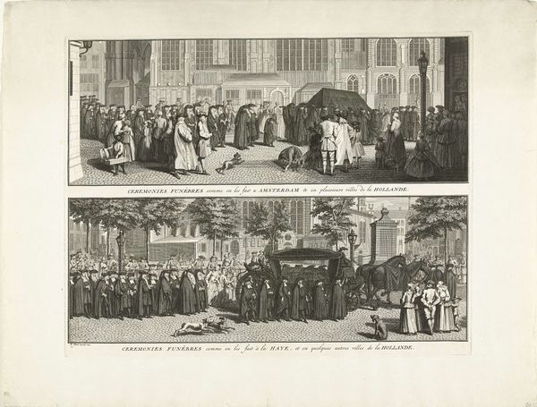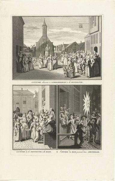 Editor: This is “Japanese God, Pagoda and Preacher,” an engraving from 1724 by Bernard Picart, housed here at the Rijksmuseum. The print is composed of three vignettes, and what strikes me immediately is the level of detail the artist achieves with what appears to be simple line work. How do you approach a piece like this, with such a high level of visual information? Curator: Precisely. The meticulousness of Picart's line is indeed paramount. Observe how each distinct area--the ‘Japanese God,’ the pagoda, and the preacher-- is given definition not through tonal variation, but through a conscious arrangement of line. Note how the artist utilizes hatching and cross-hatching techniques to describe form. This very linear construction yields clarity. What is foreground and what recedes, becomes immediately legible. The figures, architecture and landscaping are readily understood due to their structural coherence. Editor: It’s fascinating how those techniques create a sense of depth even without color. Do you see a hierarchy at play in the composition, or how are we meant to visually navigate each framed area? Curator: I think Picart invites us to visually triangulate. The upper left and upper right areas function, at least initially, as a kind of visual diptych; with the 'preacher' below serving as synthesis. Consider the geometry-- the orthogonal lines converging towards a vanishing point, which further clarifies the subject matter and, ultimately, reveals a conscious understanding of how structure begets meaning. Editor: So it’s almost like the placement mirrors the narrative – a visual statement on cultural observations. Curator: I am delighted to see how the arrangement reinforces its formal statement and reflects its content. That the meaning of an image is inseparable from its visual framework is the key.