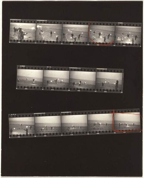 Curator: Looking at this gelatin silver print, titled “Juke Boxes 2,” produced by Robert Frank in 1955… What grabs you first, visually? Editor: Immediately, it’s the rawness, the grainy texture. You can practically feel the cheap diner Formica and the smoky air. This isn't about high art, it feels grounded in the everyday. Curator: Absolutely. To me, Frank's approach feels so unburdened, like he’s simply capturing what unfolds. There’s such a refreshing, unrehearsed honesty to it all, almost like a melancholic haiku. Editor: Exactly. I think it's interesting to see how Frank plays with the industrial aesthetic – the juke box is so central, yet mass-produced. What kind of statements might he be trying to make about production, materials, labor, or maybe even consumption in the fifties? Curator: You know, I always feel such quiet stories in these photographs. The individual in that booth seems isolated, almost consumed by the sounds— lost in a personal reverie. What did music, and access to it through devices like jukeboxes, offer to folks then? Editor: Well, jukeboxes became a focal point for community. But it also was a symbol of the growing commodification of culture and leisure, if we are honest about it. What about the materials he uses to tell his own stories, however quietly. Look closely at the choices behind that gelatin silver print— the materiality itself adds another layer to how meaning is conveyed and understood. Curator: You know, seeing all these frames together kind of reminds me of old filmstrips. You almost imagine the narrative, not unlike one playing in a tune chosen on one of those jukeboxes. Editor: Yes, there are lots of interesting, and complex, cultural references here—and the photograph's artistic choices do amplify all of this. Thinking about its own materiality actually helps put it all into clearer context. Curator: I think ultimately that tension—the collision between industry, technology, and our longing for meaning—is something Robert Frank captures so well, leaving us with a glimpse of ourselves then and now. Editor: And maybe by reflecting on materials and production here we understand a little better about those lasting tensions you're mentioning, that jukebox selection, that image…how consumption becomes intertwined with what we're looking for when we're selecting music or viewing photography.