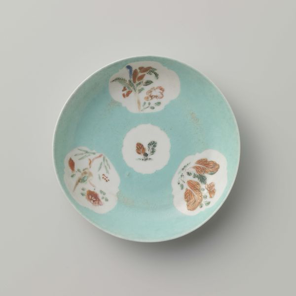 Editor: This is a Jun ware plate, crafted sometime between 1200 and 1400. The subtle hues and unpredictable glaze patterns are what draw my eye. What do you make of its composition and design? Curator: The aesthetic appeal resides precisely in what you call 'unpredictable'. Jun ware's visual signature comes from its specialized firing technique. Do you notice how the viscous glaze pools and thins? This is achieved through carefully controlled kiln temperatures. The "in-glaze" colors - that crimson splash, for example - results from liquid-liquid phase separation and the scattering of light, forming ruby-rich and blue-poor regions in the glaze layer, producing the red effect. Editor: I see, it's less about intention, more about process? Curator: The maker undoubtedly aimed for a specific range, understanding the properties of the materials, but chance plays a significant role. Consider the slightly raised rim, its delicate curve, and the way it interacts with the play of color across the dish. This relationship between form and surface modulation constitutes a complex aesthetic experience. The eye moves constantly, finding new nuances. Editor: So it’s the fusion of planned execution and almost accidental beauty that defines the piece. I never considered pottery this way! Curator: Precisely. It underscores how crucial materiality and method are in realizing visual artistry. Looking closely has helped appreciate both artistry and materiality together.