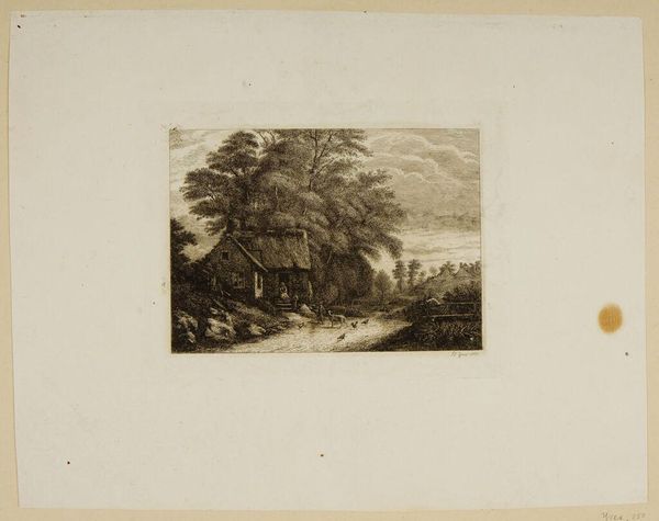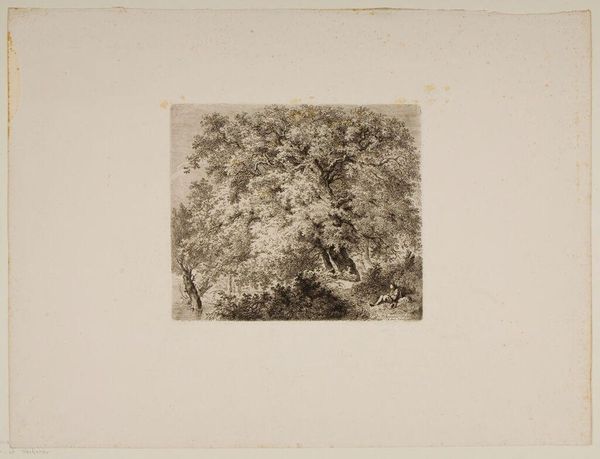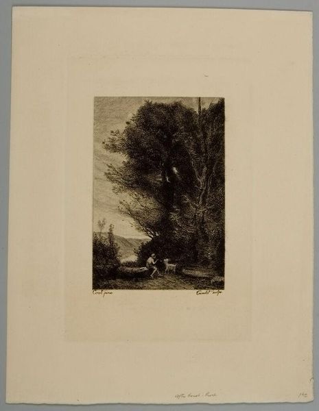 Curator: This small etching, "Children Fishing in a Rocky Brook," is by Charles André Malardot and is held in the Harvard Art Museums. Editor: It feels like a memory, doesn't it? The scene is so precisely rendered, yet it has this hazy, dreamlike quality to it. Curator: I think that's partly down to the etching technique, creating textures that are both delicate and quite rich. It was a very popular medium for landscape prints. Editor: The kids almost disappear into the landscape; they're part of that rugged beauty. Are they finding peace there or does the landscape reflect their own scrappy lives? Curator: Interesting point! Certainly, these kinds of images often get caught up in ideas about nature and national identity. Who belongs and what is their relationship to the land? Editor: So this little brook scene, it's really about a whole world of belonging. I love that! Curator: And hopefully, it inspires a little bit of that sense of belonging in you too.