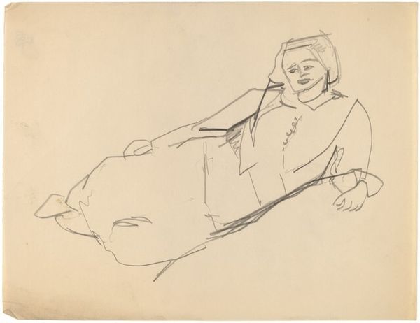 Curator: This is Josef Herman’s sketch, "Reclining Miner," held in the Tate Collection. Editor: The simplicity of the line work gives it such a casual, almost fleeting quality, yet it conveys a profound sense of weariness. Curator: Herman dedicated himself to depicting the lives of working-class people, particularly miners. His work often served as a commentary on social conditions and labor. Editor: Note how the contour lines define the form, suggesting weight and mass with incredible economy. The composition directs the viewer’s gaze to the face, a blank mask of exhaustion. Curator: The lack of detail forces us to consider the universal experience of labor, transcending the individual miner. Editor: Indeed, the stark minimalism evokes a poignant emotional response. Curator: Herman's work serves as a reminder of the dignity and resilience inherent in the working class. Editor: And a reminder of the power of suggestion in art.