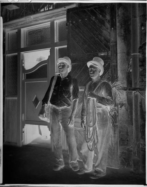 Curator: This evocative image from the Durette Studio is an "Untitled" piece, a studio portrait showcasing two girls, notable for their high button boots. Editor: The composition is striking; the inverted tones create a dreamlike, almost ethereal atmosphere. There's a ghostly quality to the light. Curator: Consider the social context. Studio portraits were a significant marker of middle-class identity and aspiration. These girls are deliberately presented as proper young ladies. Editor: The textural contrast between the smooth dresses and the intricate lacework on the boots is fascinating. It gives depth despite the limited tonal range. Curator: Their clothing signifies social class and the specific expectations placed on young women during this era, particularly around dress and deportment. Editor: The negative space around them almost makes them float. This creates an intriguing tension between the formal posing and the surreal quality. Curator: Indeed, what strikes me most is how this image documents a specific moment in time, while also hinting at broader cultural narratives of gender and class. Editor: For me, it is the balance and visual rhythm that captures attention, offering up a moment of haunting beauty, an exploration of photographic technique.