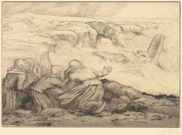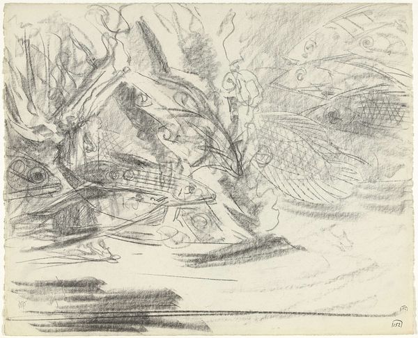 Gerrit Willem Dijsselhof's drawing, "Aquarium met kreeften," presents a study in texture and tone, realized with graphite on paper. The composition is dominated by a cluster of crustaceans in the foreground, their forms articulated through a dense network of lines that suggest both volume and the rough texture of their shells. The artist uses chiaroscuro—the interplay of light and shadow—to give depth to the aquatic scene. Dark, hatching strokes in the background contrast with the lighter, more diffuse rendering of the water, creating a sense of depth and enclosure. Dijsselhof's approach here reflects an interest in the interplay between naturalism and decorative effect, characteristic of the Art Nouveau movement. The careful arrangement of the lobsters suggests an aesthetic consideration beyond mere representation, hinting at a deeper engagement with the formal qualities of the subject matter. This drawing invites us to consider how an artist can transform a seemingly mundane subject into a study of line, form, and texture, reflecting broader artistic and philosophical concerns about representation and the aestheticization of nature.
