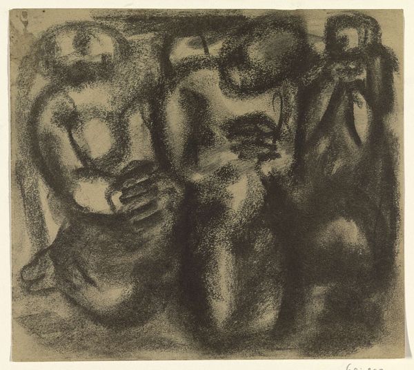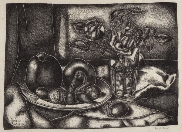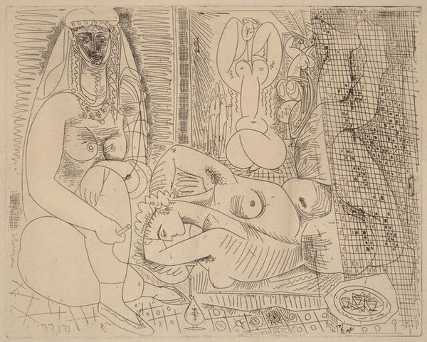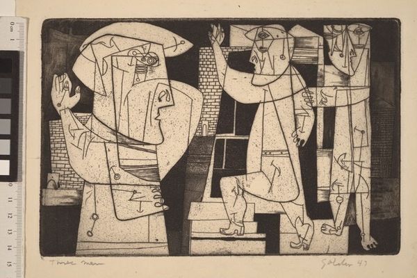 Editor: This etching by James V. Harvey, titled "Untitled (Seated Nude Model)," dates from around 1949. It's definitely a striking piece with that balance of abstraction and the figure. The composition is rather arresting. What do you make of it? Curator: Arresting is the word. To me, this image speaks of a fragmented reality, a world seen through a shattered lens. The nude figure is not celebrated in the classical sense, but rather deconstructed, almost trapped within these geometric forms. Don't you feel like the artist is asking us to consider the nature of perception itself? Editor: That’s a fantastic observation about fragmented reality, and it resonates. Do you think there's something deliberate in confining the human figure into that space? Curator: Absolutely. The artist plays with the tension between the organic and the geometric, the natural and the constructed. Perhaps it's a comment on the human condition in the modern age—feeling confined by societal structures or perhaps a disrupted sense of self after the war? Editor: That’s a powerful idea, especially considering the historical context. It definitely adds layers of meaning. Is there a particular aspect of the etching technique that stands out to you? Curator: The bold, linear quality of the etching emphasizes the sense of fragmentation. See how the lines are so sharp and definitive, yet they never quite resolve into a cohesive whole? It reinforces this idea of brokenness, you know? The negative space is just as important, creating a visual echo chamber. It has echoes of cubism, with an eye toward a modern, American aesthetic. Editor: This makes me appreciate the composition of lines and empty spaces and the way they evoke powerful ideas. Thank you for unlocking so many layers of this etching for me! Curator: It’s been a delight! Discovering new layers is the joy of these visual journeys. Now I'm off to see the expressionists!