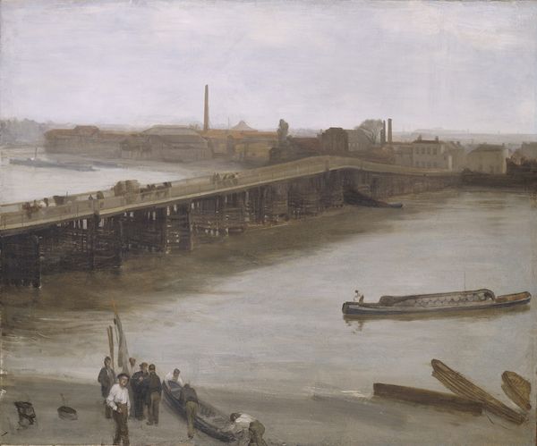 Editor: This large-scale painting, simply titled "Industrial Landscape" by L.S. Lowry, really captures a sense of bleakness with all the factories. What do you see in this piece? Curator: The dense materiality of this landscape speaks volumes about the means of production at the time. It's not just depicting factories; it's about the labour, the consumption, and the very air choked by industrial processes. Do you notice how the 'matchstick men' seem dwarfed? Editor: Yes, they almost seem like part of the machinery themselves. I hadn't thought about the people as part of the industrial process. Curator: Exactly. It highlights how human bodies became extensions of the factory system, cogs in a larger machine. Editor: That's a powerful point. I'll definitely consider that next time. Curator: Indeed, a stark reminder of the human cost embedded within industrial progress.