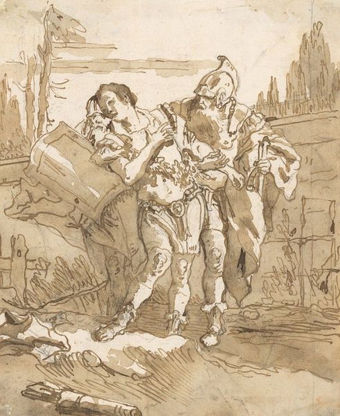 Giovanni Domenico Tiepolo created "Satyr Surprising a Satyress," with pen and brown ink with brush and brown wash on cream laid paper. The composition centers on the satyr carrying off the satyress. This dynamic scene is rendered with fluid, energetic lines that capture the spontaneity of the moment. The use of brown ink and wash creates a tonal range that defines the forms and adds depth. Tiepolo’s hatching and cross-hatching strokes, especially in the figures' musculature and the surrounding foliage, highlight the work's structural elements. The lines vary in thickness and density, contributing to a sense of movement and chaotic energy. The drawing destabilizes traditional notions of idealized beauty. The satyr's crude form and the satyress's startled gesture challenge classical standards of harmony and proportion. The landscape, sketched with minimal detail, focuses attention on the central drama. The composition is a study of the interplay between order and disorder, control and abandon, reflecting broader artistic and philosophical concerns about nature and civilization.