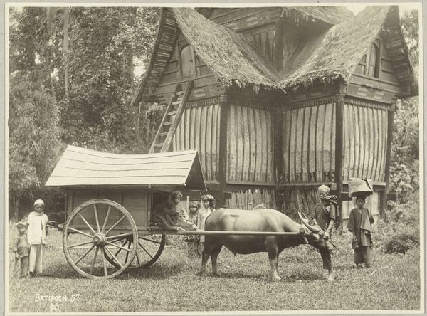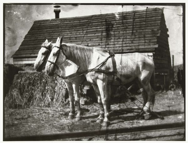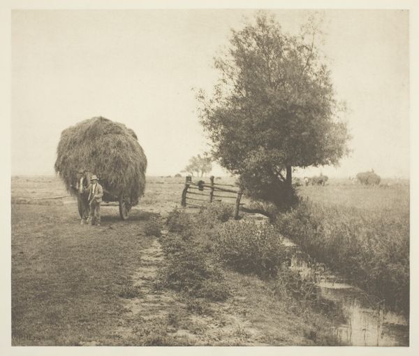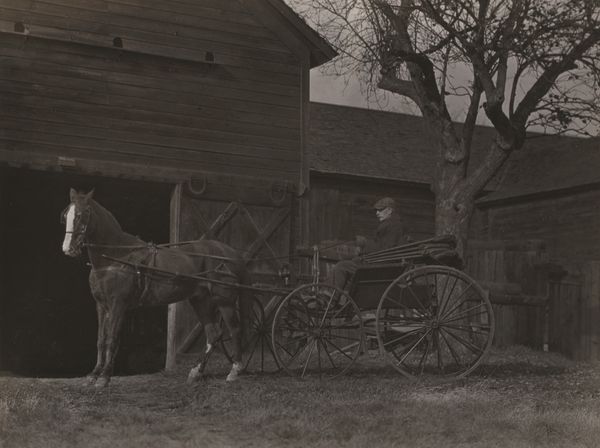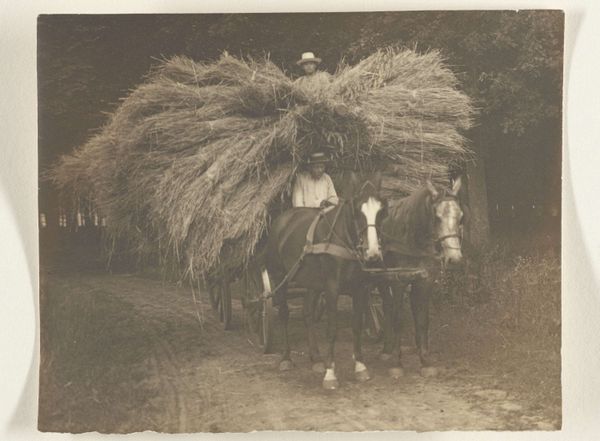 Alfred Stieglitz created this photograph, likely in the early 20th century, using gelatin silver print. The photograph's material appearance, sepia-toned and rich with textural detail, is critical to its meaning. The gelatin silver process, dominant at the time, allowed for a wide tonal range, which Stieglitz uses to emphasize the contrast between light and shadow within the barn. Look closely at the rough texture of the hay, the weathered wood of the wagon and barn, all rendered with remarkable clarity. The image captures a moment of rural life, showing a hay wagon laden with freshly harvested hay. There is a tremendous amount of labor involved in the harvesting and handling of hay, and it speaks to the fundamental relationship between humans and the land. Stieglitz captures the essence of a working landscape, elevating the everyday to the realm of art. By focusing on the material qualities of both the subject and the photographic process, Stieglitz bridges the gap between the artistic and the agricultural, suggesting that beauty and meaning can be found in the most ordinary of settings.
