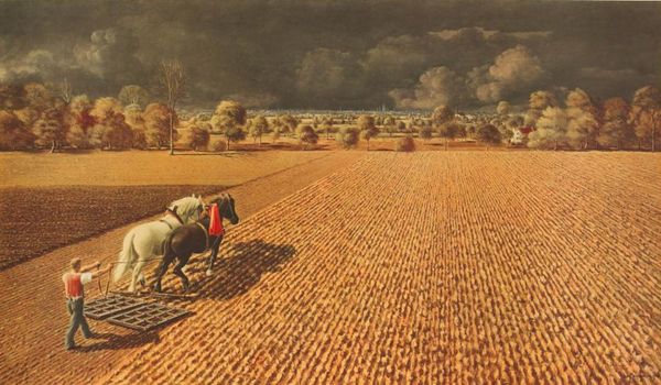 Editor: So, this is Thomas Hart Benton's "Threshing Wheat" from 1939, an oil painting depicting a farming scene. I’m immediately struck by the contrast between the golden fields and the dark, almost ominous, plume of smoke from the thresher. What symbols or deeper meanings do you see embedded in this seemingly straightforward depiction of rural life? Curator: That smoke, its dark shadow contrasting with the bounty of the harvest, indeed, speaks volumes. Think about the era – 1939. Europe is on the brink of war; America still grappling with the Depression. Benton, a Regionalist, often focused on the dignity of the everyday worker, but always with an edge. Doesn’t the scene hint at the shadows gathering, even amidst the golden fields of American promise? The steam engine suggests both progress and perhaps the destruction of a traditional way of life, a loss of an American Eden. What feeling does the contrast of organic and mechanic bring? Editor: I hadn’t considered the smoke in that symbolic way, I mainly considered it an industrial hazard. Now that I look closer, even the rounded forms of the haystacks feel…oppressive somehow, looming over the landscape almost like they are bearing down on us. It doesn’t have the joy of labour you might expect. Curator: Yes, it evokes an unease doesn't it? Even Benton's typically vibrant colours are muted here, lending to that sense of weight, the heaviness of history bearing down on the land. Notice the positioning of the figures; they're toiling, but are they joyful? Is this harvest for prosperity, or just to survive? And those rolling hills – are they symbols of abundance or are they hinting at the physical hardship involved? Editor: I see what you mean. So it's more than just a snapshot of a farming scene. It’s a coded commentary, about the complex reality of American life in the shadow of global turmoil? It's a blend of nostalgia and foreboding? Curator: Precisely! Benton masterfully layers visual cues, transforming a genre scene into something far more potent – a mirror reflecting America's anxieties and hopes, rendered through the visual language of its heartland. Editor: That's really powerful; thank you. I'll never look at a haystack the same way again. Curator: Likewise. It’s remarkable how much history and feeling can be held within an image, even in something that appears, at first glance, to be a simple scene of American life.