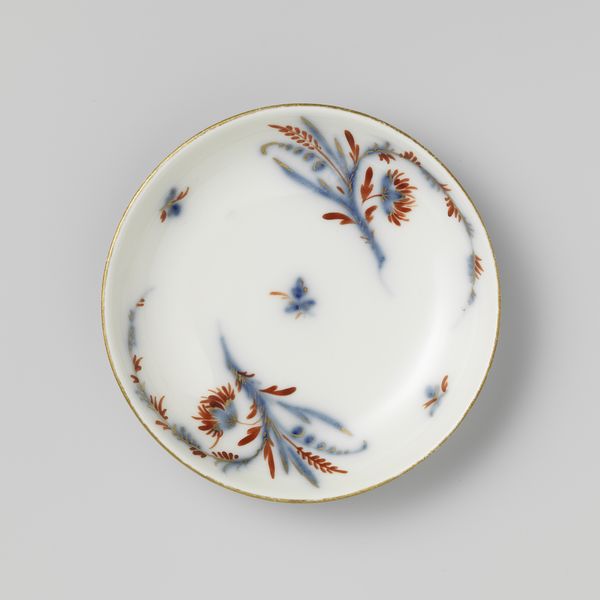 Editor: Here we have a porcelain schotel, or saucer, made by Koninklijke Porseleinfabriek Dommer & Co. between 1809 and 1814. What strikes me is the simple elegance of this piece. What story do you think it has to tell? Curator: I see this delicate porcelain saucer, with its unassuming bird motif, as a subtle reflection of early 19th-century society. Porcelain, especially pieces like this that reflect neoclassicism, speaks volumes about class, trade, and even colonial aspirations of the time. The image of the bird can also be analyzed through gender. Editor: Gender? How so? Curator: Birds were often seen as symbolic stand-ins for women in art during this era; the saucer then transforms from a simple decorative item to a medium exploring socially accepted limitations, desires for freedom, or ideas about femininity and fragility. Consider its intended use – a piece for the domestic space, reinforcing the idea of women's roles during this era. Do you agree with that? Editor: I hadn't thought about the implications of its setting! Seeing it now, I wonder how such a seemingly harmless object could speak to more complicated societal structures. Curator: It's this precise tension—the space between art and context —that brings a piece to life, challenging our conventional readings. Even the seemingly innocuous design choices have something to say about historical, social, and political contexts, provided we have the tools to ask the right questions. Editor: This makes me reconsider all decorative art... the possibilities seem endless now. Thank you. Curator: And thank you. Considering art this way helps us unearth narratives we never thought existed!
