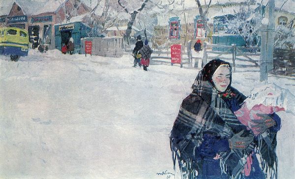 Tetyana Yablonska made this painting, Twins, with oil on canvas, and while we don't have a date for it, it feels like the 50's! The light is silvery and the colors muted, as if filtered through a snowy haze. You can really see the brushstrokes – they’re loose and quick, like the artist was trying to capture a fleeting moment. I like the texture of the snow, built up with layers of white and pale blues. You can almost feel the cold! And there’s a little girl, all bundled up in a sled, being pulled by her sister. The way Yablonska painted the sled’s blankets is so tactile – you can almost feel the wool. Everything is simplified, pared down to its essence. The sled runners, particularly, are described by a single, confident stroke. It reminds me of Fairfield Porter, who also painted these intimate, domestic scenes. Both artists find beauty in the everyday, in the quiet moments of life. Ultimately, Yablonska's painting suggests that art doesn't need to be grandiose or complicated to be meaningful. It can be found in the simple act of observing and recording the world around us.