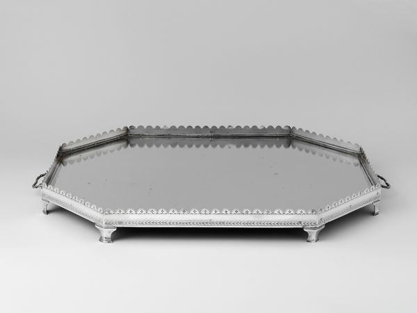 Editor: We're looking at a beautiful silver tray made in 1782 by Reynier Brandt. It has an open-work rim and little feet, it feels both ornate and functional. What strikes me is its quiet elegance. What can you tell me about this piece? Curator: Well, from a historical perspective, pieces like this were often displays of wealth and refinement within the Dutch upper classes. How do you think the design of such an object reflects societal values of the late 18th century? Editor: I suppose it signifies status; having something so beautiful suggests access to luxury. I'm curious about that open-work edge; it seems a very delicate thing to create in silver. Curator: Indeed. That intricate design speaks to the Baroque influence, even in its later stages. These presentation trays would not only showcase wealth, but also play a crucial role in social rituals—displaying tea sets, pastries, or even important documents. Consider how an object can dictate manners, influence power dynamics within a household, and how the presentation on it would create conversations and alliances. Editor: It’s like a stage for everyday life. So, this wasn’t just about owning something beautiful; it was about controlling social interaction. Curator: Exactly. Silver, particularly, had symbolic weight, indicating social standing, connection to international trade, and access to craft production. Think about how museums today perpetuate those historic systems of value, or perhaps even challenge them. Editor: I'd never thought about an object this way, so it's not just pretty, it's pretty powerful too. Curator: Precisely! The social and historical value shapes our understanding. It is a lens through which we look at art. What a gorgeous thing to remember!