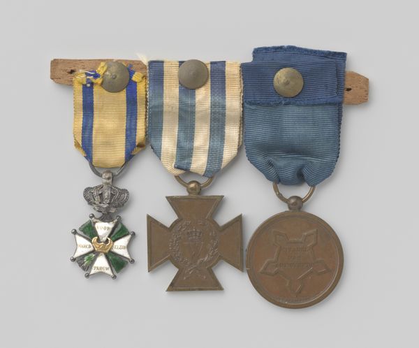 This is the Metalen Kruis 1830-1831, a medal made by an anonymous artist. The eye is immediately drawn to the cross shape and the warm brown color, which gives it a sense of historical depth and solemnity. The medal employs symmetry to create a visual order which evokes stability and strength. The design incorporates geometric forms, specifically, the Maltese cross. Its shape is a symbolic nod to bravery and military honor. Within the center of the cross, a prominent "W" is displayed, which is crowned and encircled by a wreath. These signs communicate themes of victory and allegiance. The artist’s choice of metal is particularly important, with its inherent qualities of durability and resistance symbolizing perseverance. The circular ring at the top disrupts the firm lines of the cross, inviting contemplation about the balance between formality and fluidity. This medal functions as a cultural artifact which captures a moment of history and continues to invite discourse.