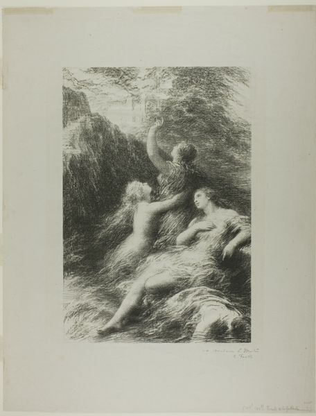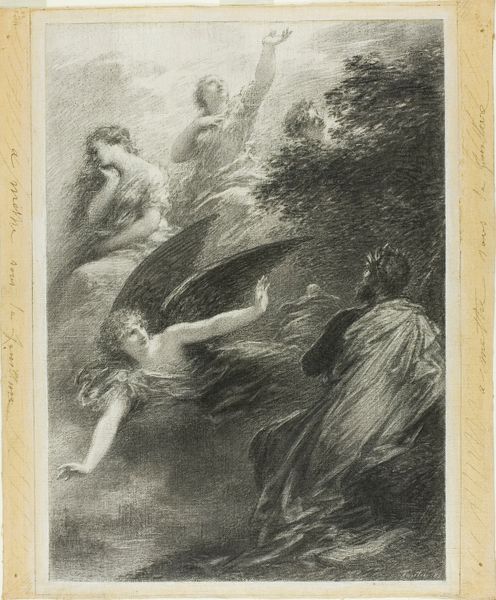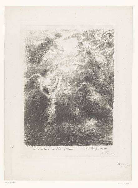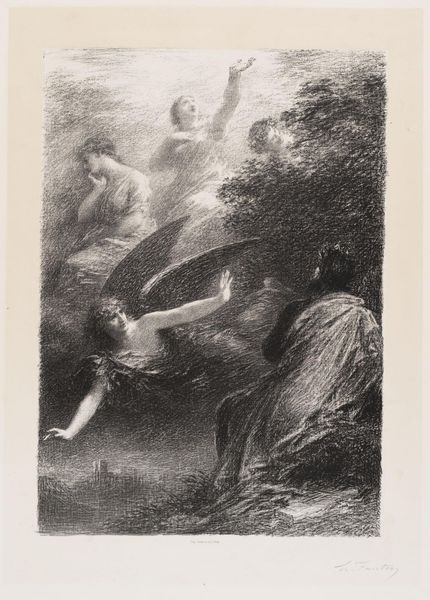 Henri Fantin-Latour created this lithograph, Paradise and the Peri: Finale, using black ink on paper. The composition is dominated by soft, ethereal forms that emerge from a darkly suggestive background. The figures, rendered with delicate lines and subtle gradations, seem to float, evoking a sense of dreamy weightlessness. Latour masterfully manipulates light and shadow to create depth and atmosphere. The subjects are positioned so that the viewer's eye is drawn upward towards the source of light where figures become increasingly indistinct and dissolve into the surrounding space. This emphasis on the transcendence of form aligns with Symbolist aesthetics. The structural arrangement of the figures—clustered yet distinct—infuses the scene with a dynamic tension. We might see the subject as a study in contrasts: darkness and light, solidity and ethereality. Latour invites us to reflect on the liminal states between existence and transcendence, inviting an ongoing dialogue between the artwork and its viewers.