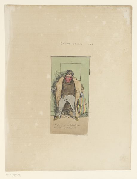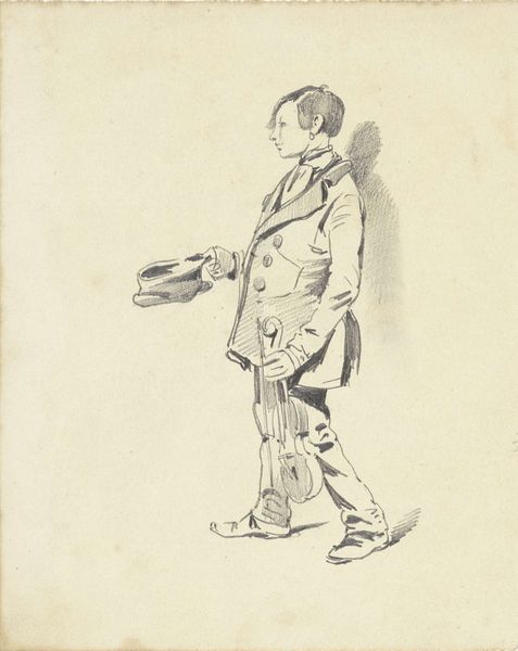 Francis Law Durand created this watercolor drawing of a doll. The doll is depicted with a soft color palette on a neutral background. Durand's choice of watercolor as a medium influences the appearance of the drawing, lending itself to the soft and subtle tones which emphasize the doll's contours and features. The transparency of the watercolor allows the white of the paper to shine through, creating a sense of lightness. The doll is depicted with enough detail to suggest the clothes it is wearing and its physical features. The act of creating a watercolor drawing involves a degree of skill and control. Watercolor painting has a long history within fine arts, and has often been used for illustration and documentation purposes. The artist's choice of subject matter and medium reflects an interest in childhood, and the labor involved in the making of the doll. This connects to broader social issues of labor, politics, and consumption. Paying attention to the materials and processes involved in the creation of this artwork allows us to gain a deeper understanding of its meaning and significance.
