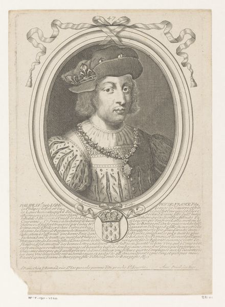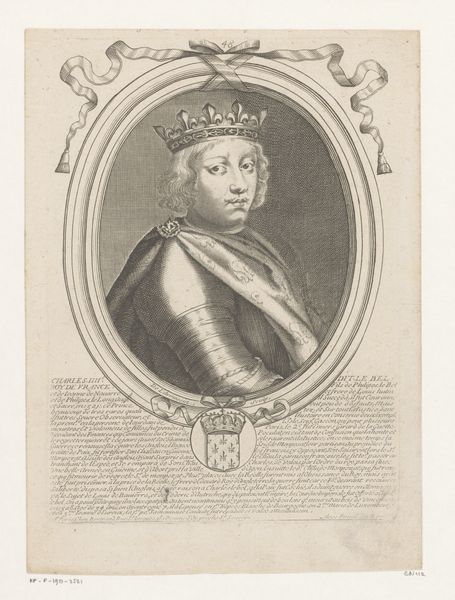 Curator: This is a portrait of Charles VII, King of France, rendered in an engraving. The work, attributed to Nicolas de Larmessin I, dates from between 1642 and 1678. Editor: It feels surprisingly formal, even static, for a portrait from the Baroque period. All those precise lines! What was this originally made for, mass distribution? Curator: Certainly. This kind of printmaking facilitated a broader reach of royal imagery and the projection of power. Think about who would have encountered this print: the merchant class, aspiring nobles, people hungry for a tangible connection to power. Its material accessibility reconfigured social relationships to the crown. Editor: The detail in the armour and the royal regalia – the crown and the chain – really speaks to the value placed on these markers of status and material wealth. It's also interesting to consider the labor involved in creating this kind of print. How long would this have taken Larmessin? And what was the economy of printmaking like? Curator: Exactly, and considering that it is an engraving, the reproduction suggests the deliberate and methodical spread of ideology. This particular depiction reflects how Charles VII was presented to the world. This connects to broader historical themes like identity and social order during the reign. Consider also that this portrait occurred long after his reign ended in 1461; what function does a retrospective royal portrait serve? Editor: It makes me think about how prints like these helped normalize notions of hierarchy, with the King literally framed and elevated, in his armor as a material testament to protection and rule. You also see so many different qualities and labor practices in it: the high craft and aesthetic qualities of printmaking itself, with an emphasis on materials, the iron of the armor, the supposed gold in the chain. It all represents different methods of production. Curator: And even the deliberate repetition inherent in printmaking allows a mass dissemination of power dynamics to different consumers. This engraving provides us with an access point into the intersectional relationships between royal identity, economic control, and class. Editor: Agreed. Seeing it laid bare in these etched lines forces us to consider the social relations inherent in the printmaking process, and to remember the labor behind every copy distributed across the realm. Curator: A fascinating insight into the social dynamics of seventeenth century France through printed media. Editor: Absolutely, it's made me really rethink my initial read of it as "just" a royal portrait.