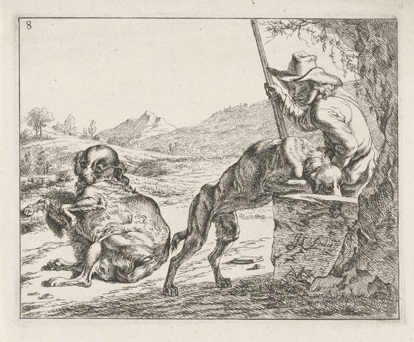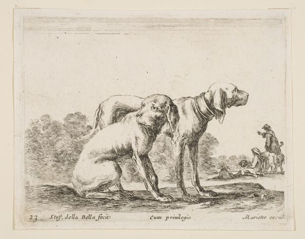 Simon de Vlieger made this print, "Hazewindhond en jachthond," around the mid-17th century, using etching. Etching involves coating a metal plate with wax, scratching an image into it, and then bathing the plate in acid, which bites into the exposed metal, leaving an impression that can then be inked and printed. De Vlieger’s skill with the medium is clear; look at the fineness of the lines, used to evoke the dogs' fur and musculature. The thinness of the lines create a sense of texture which invites you to imagine the quality of the dogs' coats. The choice of etching speaks to a broader culture of printmaking in the 17th century, where artists engaged in the skilled traditions of production. Prints like this one were part of a growing market for images, and thus linked to early capitalism and consumption. And while de Vlieger was certainly a skilled artist, his printmaking practice involved labor, politics, and the demands of a commercial market. So by considering the materiality and means of production, we can understand more fully the cultural and economic context of this print, and its place in a longer history of art and craft.