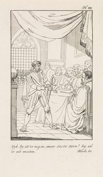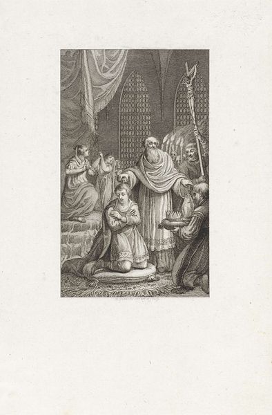 Daniël Veelwaard created this print, "Man bij een bisschop bij een sterfbed," using etching. It's now held in the Rijksmuseum. This image reflects Dutch social life in the late 18th or early 19th century, a period marked by significant political and religious change. The scene presents a tableau of death and mourning, overseen by a bishop. Note how the bishop mediates between the dying individual and the rest of the group. This hints at the central role of the church in Dutch society. The presence of the sword suggests a figure of status, while the gathering of onlookers emphasizes the public nature of death. To truly understand this work, we can delve into the religious and social customs of the Netherlands at the time. We need to consider the role of the church, the conventions around death and mourning, and the status of the person depicted. Through such historical investigation, we can begin to understand this print as a commentary on the social structures of its time.
