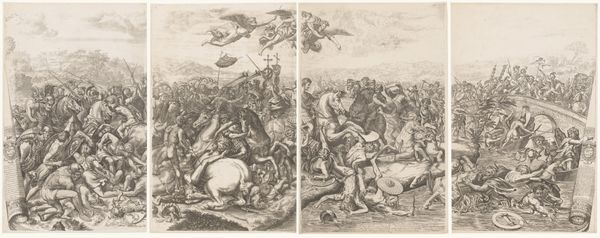 Pierre Scalberge created this print, *Slag bij de Milvische brug (tweede deel)*, in the early 17th century. It’s made using a printing technique called etching, where lines are incised into a metal plate, and then filled with ink to create an image. Etching has a distinctive graphic language. Look closely, and you’ll see that the image is built up with an accumulation of thin, precise lines that define form, texture and shadow. Unlike painting, where brushstrokes can be blended, each mark in an etching stands alone. The etched line also allows for the creation of multiples, meaning that this artwork could be widely distributed. Scalberge’s choice of etching was thus a means of democratizing his image, and of embedding it in a wider culture of reproduction and consumption. It’s a reminder that every artwork is also a product, shaped by the social and economic conditions of its making.