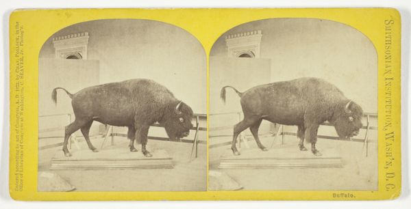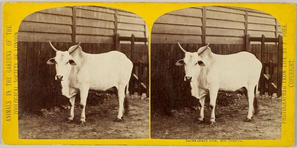 Editor: This photograph, titled "Banteng stier met grote hoorns" by Neville Keasberry, dates to sometime between 1900 and 1935. It's a gelatin-silver print, which gives it a silvery, almost metallic sheen. It looks like it depicts a Banteng bull at a zoo. What can you tell me about this photograph? Curator: Focusing on the materiality, we must examine what it means to capture this creature within the constraints of gelatin-silver print technology, the labor involved in staging and producing this image, and the systems of display through which it was and continues to be consumed. The photograph does not simply record a bull. The silver gelatin print becomes an object reflecting colonial era’s interest in exoticizing and classifying the natural world, and that relates to how photographic technology was evolving for documentation. What systems do you observe beyond this single capture of a bull in its stall? Editor: The “Stereoskopische Fotografie” text printed along the border indicates it was likely made as a stereo image, for viewing with a stereoscope. Would that heighten the exotic appeal of the bull when experienced as three-dimensional? Curator: Precisely! Consider the consumption of such images: viewed through a stereoscope, emphasizing the animal's otherness for primarily Western audiences. Note the built enclosure too – a fabricated habitat. How does the artist highlight not the freedom of an animal but its manufactured landscape through gelatin and silver? Editor: That reframing changes everything. I wasn't even thinking about that. Thanks, I’ll never be able to look at a picture of an animal without questioning its context again. Curator: Exactly! The value doesn't lie solely in representation, but also the historical context. Let us think about it materially; it speaks of consumption and fabrication even in a seemingly simple photographic image.