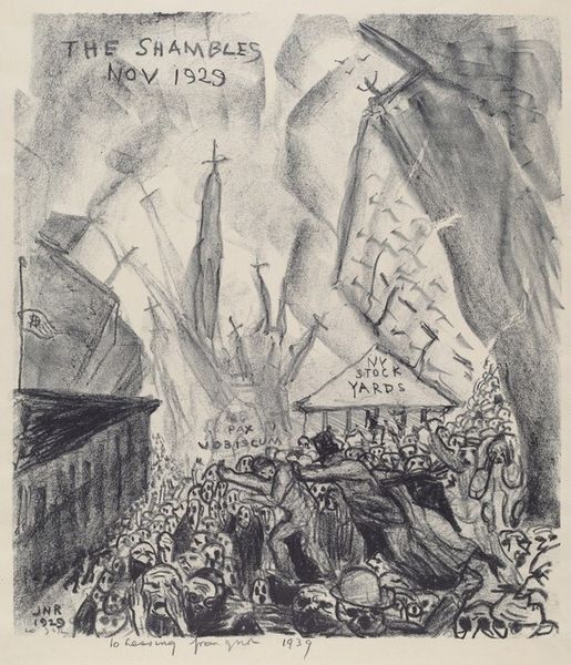 Curator: Here we have Max Pechstein’s 1918 woodcut, "Somme." It is a powerful example of Expressionist printmaking capturing the brutal landscape of the First World War. Editor: Right away, it’s like a punch to the gut. All those bleak, scratchy lines, the harsh sun, it feels devoid of hope. The faceless figures marching onward are incredibly chilling, aren’t they? Curator: Absolutely. Pechstein, like many German artists of his generation, was deeply affected by the war. Although not on the front lines, his experience as a medic gave him first-hand exposure to its trauma, profoundly influencing his art. Editor: It really does read like a bad dream—or rather a nightmare given real form through art. I am particularly struck by that distorted church tower and sun motif behind it; they almost seem mocking or oppressive, casting a shadow over the soldiers. Curator: That contrast is central. Consider that much early 20th-century art served as propaganda for all sides during World War I. "Somme", by comparison, resists that. Its Expressionistic style emphasizes subjective emotion, communicating Pechstein’s inner turmoil as well as revealing an uncensored impression of destruction and desolation. The angular lines and stark black and white emphasize raw emotions and loss in a world upturned. Editor: It reminds us that art can bear witness in ways that written history sometimes can’t, conveying feeling more viscerally than any description of landscape. Look at the sun's rays almost cutting across the image with aggressive intention. It's brutal. It sears in like some kind of psychic scar or brand across the wounded earth itself! Curator: That’s a good point, and one often overlooked today. At the time Pechstein created "Somme", prints such as woodcuts and lithographs were seen as affordable, more accessible ways to get artwork into the homes of everyday citizens, bringing ideas to the public, often cheaply. "Somme" served as a strong counter-narrative to prevailing pro-war sentiments. Editor: "Somme" isn’t about glory or victory; instead it confronts you with devastation. We’re reminded that behind statistics there are actual humans enduring pain, something easily obscured in times of large-scale conflict. Thank you for highlighting this forgotten work. I felt moved deeply today. Curator: Indeed. It is easy for artwork from over a hundred years ago to get buried beneath shifting times, especially if such works resist prevailing contemporary mores. I’m grateful you shared your insight with our listeners. Hopefully some people visiting here today will reconsider art of this time through the more personal view offered by Pechstein's expressionistic statement here.