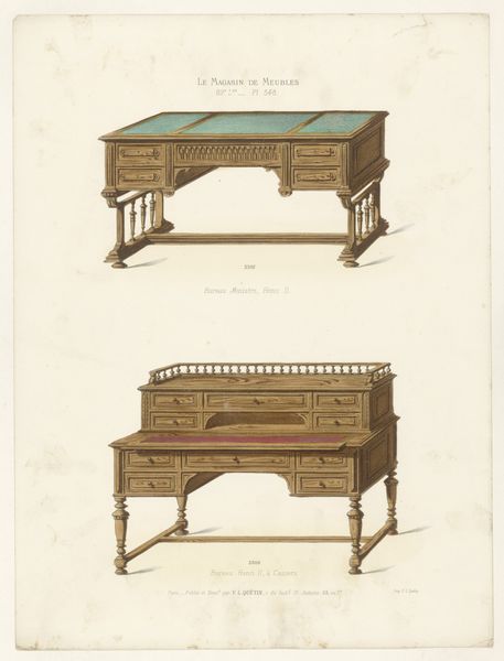 Editor: This print, “Twee salontafels in Engelse stijl,” or "Two Coffee Tables in the English Style," by Léon Laroche, likely made between 1895 and 1910, shows two nearly identical tables. They feel so formal and posed, somehow. What do you make of them? Curator: Well, I immediately think about the rise of industrial capitalism during this period and the shift towards consumer culture. These prints, seemingly benign, served a key function: promoting a certain lifestyle and, with it, a certain vision of class and social aspiration. Editor: So, like advertisements, in a way? Curator: Precisely! Consider how the title explicitly links the style to “Englishness." This connects the furniture not just to a geographic location, but to an aspirational identity laden with social meaning tied to class, colonial power, and gender expectations during the late 19th and early 20th centuries. These aren’t just tables, they're signifiers. Editor: Signifiers of wealth, and a particular idea of "English" refinement, perhaps? Curator: Absolutely. The neoclassical style itself, with its clean lines and suggestion of historical importance, harkens back to a period loaded with gendered ideas. It creates a "refined" space for women's work within the home. How do these prints play a role in maintaining power structures? Consider where these images would be displayed. Were they affordable to all members of society? Who was excluded from that idealized image of domestic life, and what kind of work allowed such luxuries to exist in the first place? Editor: I never considered that the intended function might be as a kind of blueprint for constructing a domestic ideology! It’s amazing how much is communicated, not just by the object itself, but its representation and distribution, too. Curator: Exactly! Everything, especially something seemingly as straightforward as furniture, can be read within complex cultural narratives.