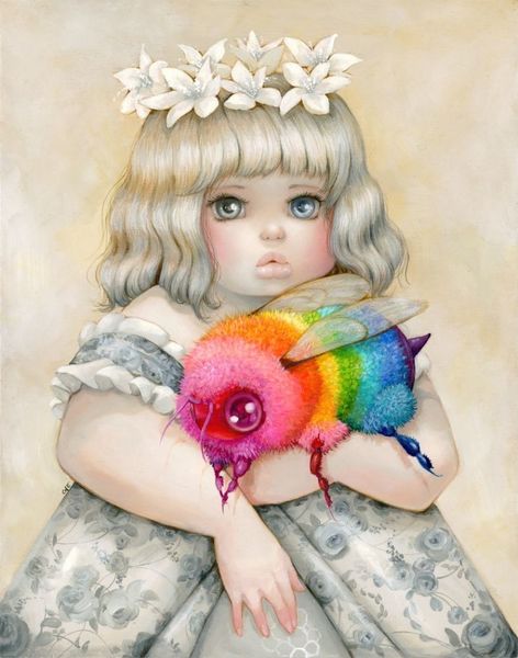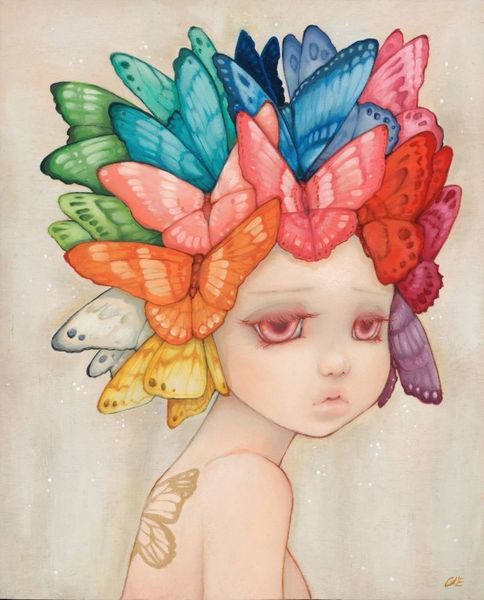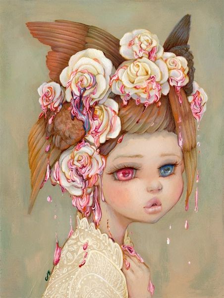 Daria Theodora, a 20th-century artist, created this drawing, titled “Ambivalence”. The overall impression is one of ornate beauty, where a figure is encircled by a profusion of floral and faerie-like elements. The composition is dense, with many details competing for our attention. The artist arranges a central portrait within an oval format. Its tight structure is disrupted by the tension between organic and ethereal elements, and the figure's gaze, downcast, pulls the viewer into a space of introspection and uncertainty. This creates a semiotic interplay between the outer beauty and inner turmoil. The use of color in the artwork is striking, predominantly warm reds and golds. The artist’s mark-making challenges fixed categories, inviting the viewer to explore a space where beauty and melancholy coexist, reflecting art’s capacity to destabilize our understanding and engage us in perpetual interpretation.