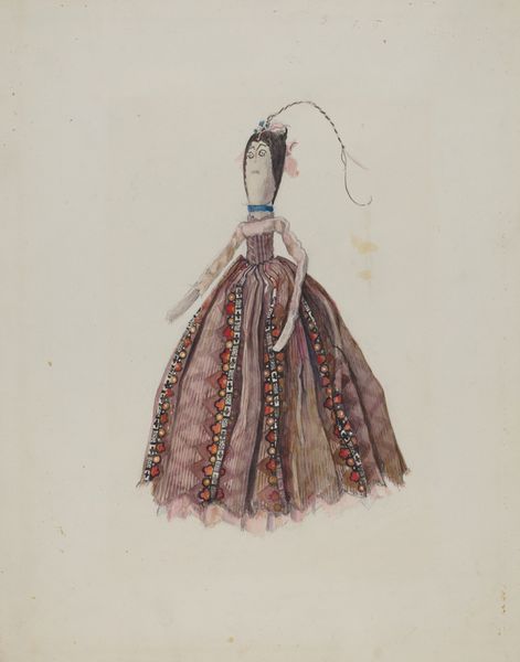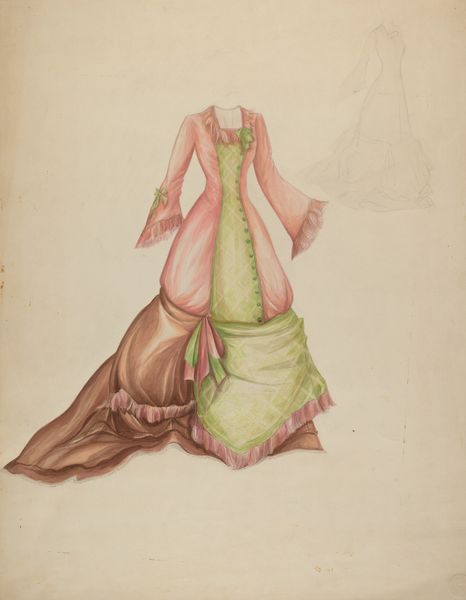Ray Price created this watercolor drawing of a dress, sometime between 1855 and 1995. Price’s rendering of the dress is fascinating because fashion is so often a marker of identity and social position. Made in America, we can consider how the dress might reflect changes in social structures, economic conditions, or political movements during Price's lifetime. Was it intended to evoke an earlier, perhaps idealized, era of social grace? Or did it challenge contemporary fashion trends? The inclusion of a schematic outline on the right suggests that Price was concerned with the design and construction of the garment, rather than just its appearance. By examining fashion magazines, social histories, and museum collections of clothing from the time, we can start to understand the place of this dress within a specific cultural and historical context. Understanding the social and institutional context is crucial to unlocking the full meaning of this artwork.