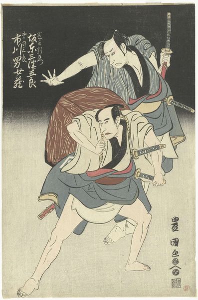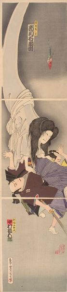 Editor: This intriguing print, "Ghost of Sogo's Wife" by Toyohara Kunichika, really captures a sense of dread. What strikes you about the historical context of this piece? Curator: Well, this print speaks volumes about the societal constraints placed on women, doesn't it? Consider the powerlessness of women in feudal Japan, and the ghost as a symbol of suppressed rage. How does the artist use visual language to convey her torment, do you think? Editor: I see the exaggerated, almost grotesque features and the way she seems to tower over the men as a sign of the character's anger. Curator: Precisely. Her haunting presence is a direct result of patriarchal structures. It prompts us to reflect on how societal injustices can manifest in art, challenging those power dynamics. Editor: I never thought about it that way before. The print feels more like a protest now. Curator: Exactly! Art is a tool.