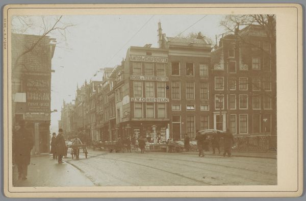 Editor: So, we're looking at "Gezicht op het Oost-Indisch Huis in Amsterdam," taken sometime between 1868 and 1875 by Andreas Theodorus Rooswinkel. It’s a photograph, a sepia-toned print. What strikes me is how…ordinary it looks. For something tied to such a powerful entity like the Dutch East India Company. What do you make of it? Curator: The very ordinariness you perceive is, I think, key to understanding its social role. By the late 19th century, the Dutch East India Company, though defunct, remained a potent symbol. This image presents a carefully constructed narrative, doesn't it? Editor: How so? Curator: Consider the image’s potential audience. Middle-class Dutch citizens, perhaps? Seeing the former headquarters – once a hub of global trade and colonial power – presented in this quiet, almost domestic light normalizes that history. It makes it seem like a quaint piece of the cityscape, rather than a place of contested global power. Look at the street itself - it's not teeming with activity, suggesting this institution's bygone power. Editor: That's a great point, presenting this image makes its presence within the landscape banal. Like saying 'this all happened, but now look at it as part of our normal everyday'. It does make you wonder what Rooswinkel's intent was, right? Curator: Indeed. The photographer, Rooswinkel, was likely making a conscious choice about how to represent this powerful symbol. We must always ask: Who benefits from this representation, and what histories are being subtly erased or downplayed? Editor: I guess I initially saw it as just a snapshot of a building. Now I see it’s actively shaping how viewers might think about Dutch colonial history, even in a seemingly objective form like photography. Curator: Precisely! Every image has its public role and power. Even a simple photo of a building has the potential to be very politically loaded.