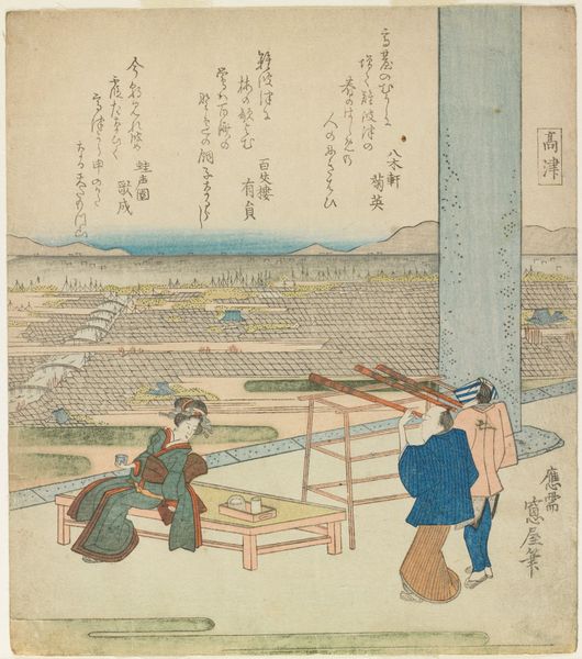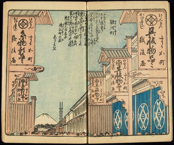 Editor: This woodblock print, "Two Views: Waterfront at Kaigan-chō, 3-chome and 4-chome, and the Entrance to the Gankirō Tea House" was created in 1860 by Utagawa Sadahide. The diptych arrangement, contrasting an elevated view of a cityscape with a ground-level tea house scene, is striking. I’m particularly drawn to the detailed rendering of everyday life, but I am curious, how do you interpret the work's contrasting settings within the socio-political climate of the time? Curator: The juxtaposition of the commercial waterfront and the leisure space of the tea house is key. Consider the political undercurrent. This piece was created at a time of significant social stratification. The elite merchant class and the geishas and performers in these tea houses had great influence in society, yet they were socially restricted. Sadahide places two separate but linked spaces side by side. Notice the arrangement and visual connection; what statements might Sadahide make about class and accessibility in urban society? Editor: That’s fascinating. The tea house seems almost like a rebellion against the strict societal norms, an assertion of cultural agency, while the cityscape portrays those in charge? Curator: Precisely! The tea house, a space for art, conversation, and pleasure, was often seen as subversive. In this work, Sadahide seems to be examining not only physical spaces but social roles and restrictions. Ukiyo-e prints like this became a voice of the populace at that time. Do you agree that a case can be made to interpret that both these locations had strong gender norms? Editor: Yes! Viewing it from the lens of gender, the tea house offered women certain opportunities. But I also realize they were often bound to roles that disempowered them, so, although opportunities are offered, we should note that they're not always beneficial. It completely reframes the narrative of enjoyment of beautiful, traditional places as somewhat exploitative. Thank you, that helps understand Utagawa's intent and depth in the context of societal pressures. Curator: And by recognising these contradictions, we enrich our appreciation. It forces us to confront the difficult realities intertwined with even the most appealing historical narratives.
