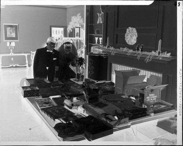 Curator: This intriguing photograph by Martin Schweig captures a woman wiping her nose during what appears to be a very formal banquet. Editor: Oh, wow, talk about relatable! The poor woman. It's like a still from a dream, maybe a slightly awkward, slightly funny dream. Curator: Exactly! It's fascinating how Schweig disrupts the expected decorum. It makes us question who is allowed to show vulnerability and when. Is this a commentary on class, gender, or both? Editor: Definitely a clash. I feel for her. It's like that moment you realize you're not as polished as everyone thinks you are. Beautifully imperfect, I'd say. Curator: Indeed. It reminds us that even within the most staged environments, human moments persist, and Schweig's photograph gives those moments a voice. Editor: It's like a secret wink from Schweig. I'm glad he saw her, really saw her. It is beautiful, in its own unexpected way.
