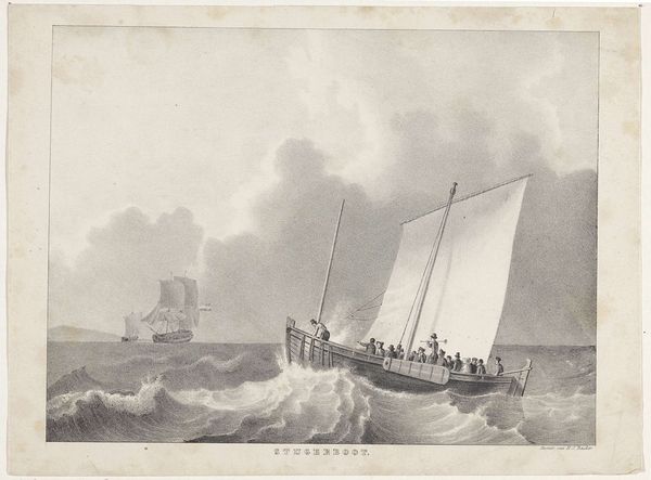 This is "Woelige zee met zeilschepen," or "Rough Sea with Sailing Ships," an undated work on paper by Christiaan Cornelis Kannemans. The monochrome palette immediately evokes a sense of drama and turmoil. The scene is dominated by turbulent waves and sailing vessels struggling against the elements, rendered with visible brushstrokes and layered washes. The composition emphasizes instability. The tilted angles of the ships and the dynamic rendering of the waves create a sense of unease. Kannemans uses a limited range of tones to suggest depth and atmosphere, drawing the viewer into the heart of the storm. We can see the artist has made strong use of chiaroscuro to emphasize the forms of the waves and the sails. This artwork doesn't just depict a scene; it embodies a set of relationships between form and content, signifier and signified. It encourages us to reflect on our own understanding of nature, representation and the human condition. It's a reminder that art is always open to new interpretations.
