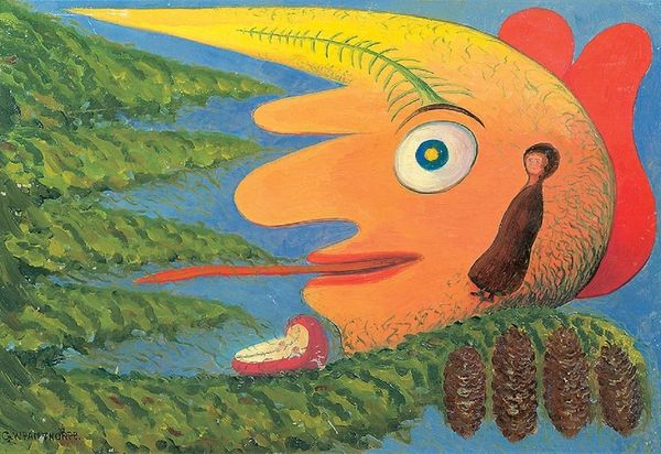Ivan Generalic’s ‘Crucified Rooster’ is a painting, likely made with oil or egg tempera on glass, a medium associated with the naive art tradition of the former Yugoslavia. The smooth surface and vivid color are characteristic of this technique, but it’s the subject matter that really grabs you. Generalic presents us with a rooster nailed to a cross – a startling image that blends folk symbolism with Christian iconography. Consider the labor involved: not just the artist's hand meticulously applying paint, but the implied work of farming, the life and death cycle represented by the wheat field. The rooster itself, a barnyard animal, becomes a potent symbol of sacrifice. Generalic, who came from a peasant background, often used his art to comment on social issues and rural life. By choosing such humble materials and direct imagery, he elevates the everyday and challenges our notions of what "high" art can be. It's a powerful reminder that art can be found in the most unexpected places and materials.