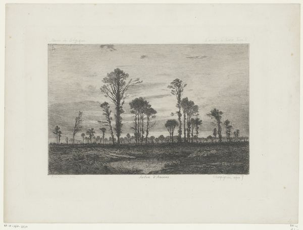Carel Nicolaas Storm van 's-Gravesande created this print, ‘Bosrand bij Kalmthout’, using etching techniques. The verticality of the trees strikes the eye, evoking a yearning to bridge the earthly and the transcendent. This motif, the tree, transcends mere arboreal representation. Consider its echoes through time. In ancient mythologies, the tree is the axis mundi, connecting underworld, earth, and sky. The Nordic Yggdrasil or the Tree of Knowledge in the Garden of Eden both embody the vital link between realms, a cosmic pillar. Here, these trees stand on the edge of this 'Bosrand bij Kalmthout,' a frontier between known and unknown. They stir deep within us a collective memory of nature's primal power, of forests as both refuge and places of fear. In this landscape, the trees invite a meditation on nature's enduring presence and its reflection in our shared human consciousness.