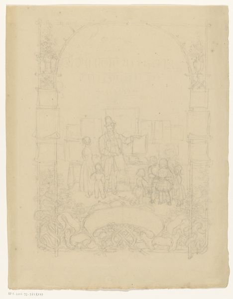 Editor: This pencil sketch, "Interieur," attributed to Firma Feuchère, dates from around 1830 to 1850. It's quite delicate, almost ethereal. What do you see in this piece, especially regarding its portrayal of domestic life? Curator: Beyond the surface of a genteel interior, I see a subtle commentary on the constraints and performances of women's roles in the 19th century. Consider the careful arrangement of space, and how the figures are positioned. Does this domesticity empower, or does it subtly imprison? Editor: Imprison? That's an interesting take. I see elegance, but not necessarily confinement. Curator: But think about the visual language. The detailed architecture surrounding these women could be seen as representative of societal structures. Are they active agents in this space, or are they merely part of the decor? Are their identities shaped *by* the architecture itself? Editor: I see what you mean. It raises questions about their agency and how their identities might be constructed within these spaces. What about the 'unfinished' quality of the sketch? Does that have meaning? Curator: Absolutely. It's not just a snapshot of a room. This ‘Interieur,’ and others like it, invite conversations around the lived experiences of women and their restricted autonomy during this time, and perhaps about how those restrictions are symbolized through the arrangement of their physical surroundings. It's about the unseen structures shaping visible realities. Editor: It’s fascinating how a simple sketch can open up so many layers of interpretation, looking at gender, social norms, and physical space. Thank you. Curator: It’s in considering these layers that the true dialogue with art history begins. We must keep asking: Whose stories are represented and, importantly, whose are missing?