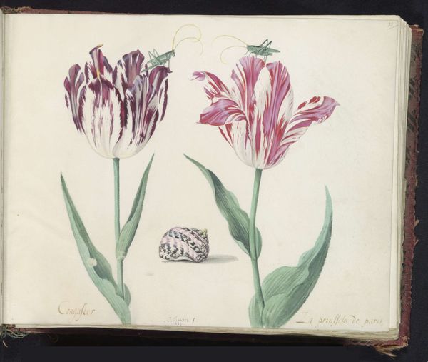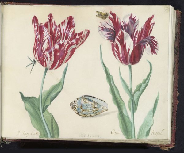 This is a page from a book of flower illustrations by Jacob Marrel, an artist working in the Netherlands during its Golden Age. These illustrations are more than just pretty pictures; they offer insight into the economic and cultural landscape of the time. Tulips, especially those with striking color variations like the ones depicted, were highly sought after and valuable. The craze for them, known as “Tulip Mania,” gripped Dutch society in the 17th century, inflating prices to absurd levels before the market crashed. Marrel’s precise rendering of these flowers, along with the inclusion of a shell, dragonfly, and butterfly, speaks to the Dutch fascination with the natural world and their burgeoning scientific curiosity. These natural history illustrations were often commissioned by wealthy patrons. To fully appreciate the historical significance of this image, we can consult archival records such as trade documents, market reports, and scientific treatises. These resources help us understand the complex relationship between art, commerce, and scientific inquiry in the Dutch Golden Age.