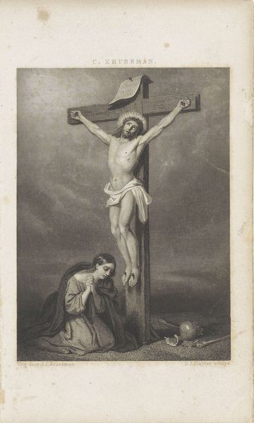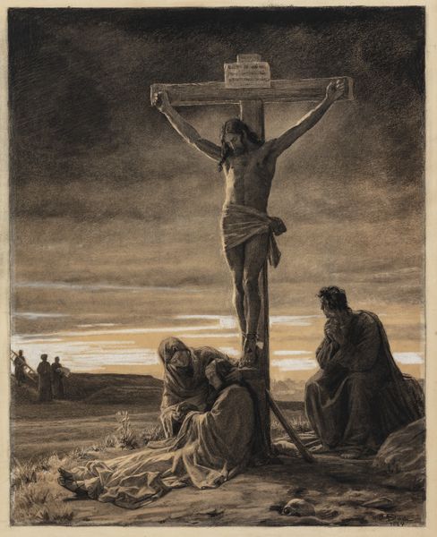 Editor: Right now we're looking at Carl Bloch's "Christ on the Cross," an etching from 1884. The starkness of the graphite gives the scene such a weighty, somber feel. It really emphasizes the solitude of the moment, doesn't it? What jumps out at you when you look at it? Curator: The sheer vulnerability, I think. Notice how Bloch positions Christ—not heroically posed, but almost slumped. And then the landscape. It's bleak, almost oppressive. Makes you wonder what he's trying to say about faith and abandonment, doesn't it? Almost makes you wonder if even the heavens have turned their backs on this moment. Do you see the figures at the foot of the cross? They seem to be sinking into the earth itself, swallowed up by their grief. Editor: That's a great point about vulnerability! The other figures are drawn very intimately...Was it typical to portray religious scenes with this much...raw emotion at this time? Curator: You know, what strikes me is how unconventional it actually is! Bloch, despite working within a religious framework, manages to tap into a universal sense of suffering. It’s intimate, as you noted, and almost painfully human. I think that's what makes it so powerful, even now. It dares to imagine, in raw terms, what such a devastating event would mean, how it would *feel*. Editor: That resonates a lot! It's much more personal than I initially gave it credit for. I was so focused on the composition that I missed the individual feeling. Curator: Precisely. Art does that, doesn’t it? Reveals itself in layers, like peeling an onion... only hopefully less tear-inducing. Editor: Absolutely. It definitely gives you a lot to consider about finding meaning in desolation, artistically and perhaps personally too. Curator: A truly reflective encounter! It brings us back to asking, in what ways can we accept the burden of loneliness or anguish? Are these expressions inherently beautiful?